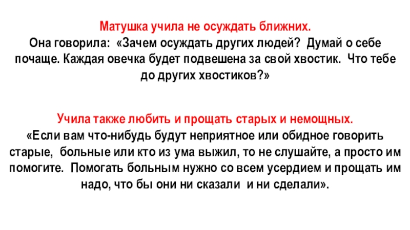 «Если вам что-нибудь будут неприятное или обидное говорить старые, больные или кто из ума выжил, то не слушайте, а просто им помогите. Помогать больным нужно со всем усердием и прощать им надо, что бы они ни сказали и ни сделали».