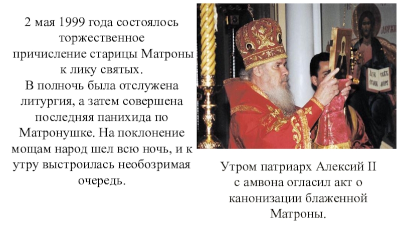 Утром патриарх Алексий II с амвона огласил акт о канонизации блаженной Матроны.
