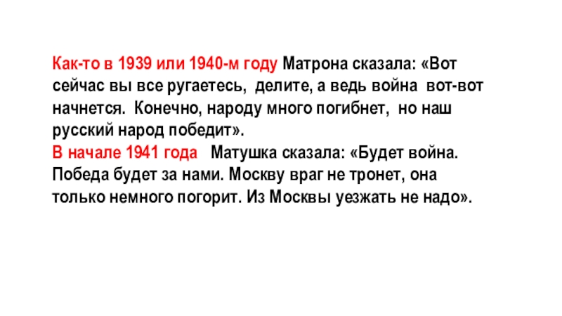 Слайд 10Как-то в 1939 или 1940-м году Матрона сказала: «Вот сейчас вы
