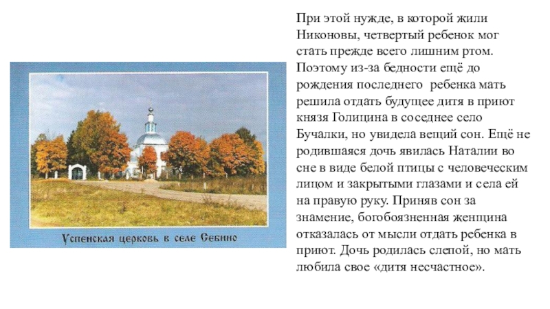 прежде всего лишним ртом. Поэтому из-за бедности ещё до рождения последнего ребенка мать решила отдать будущее дитя в приют князя Голицина в соседнее село Бучалки, но увидела вещий сон. Ещё не родившаяся дочь явилась Наталии во сне в виде белой птицы с человеческим лицом и закрытыми глазами и села ей на правую руку. Приняв сон за знамение, богобоязненная женщина отказалась от мысли отдать ребенка в приют. Дочь родилась слепой, но мать любила свое «дитя несчастное».