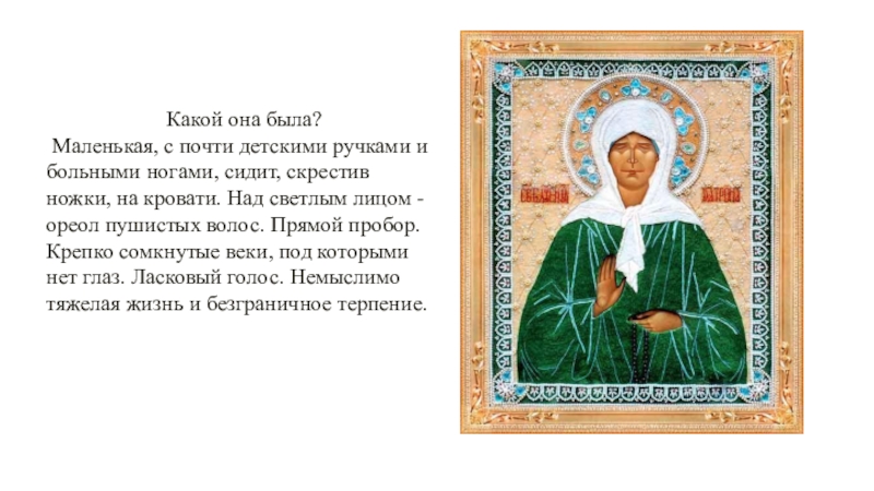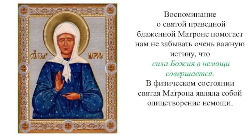 Слайд 13Блаженная Матрона помогает понять, как мы должны жить и в условиях