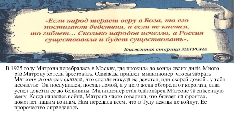 своих дней. Много раз Матрону хотели арестовать. Однажды пришел милиционер чтобы забрать Матрону ,а она ему сказала, что слепая никуда не денется, иди скорей домой , у тебя несчастье. Он послушался, поехал домой, а у него жена обгорела от керогаза, едва успел довезти ее до больницы. Милиционер стал благодарен Матроне за спасенную жену. Когда началась война, Матрона часто говорила, что бывает на фронтах, помогает нашим воинам. Нам передала всем, что в Тулу немцы не войдут. Ее пророчество оправдалось.