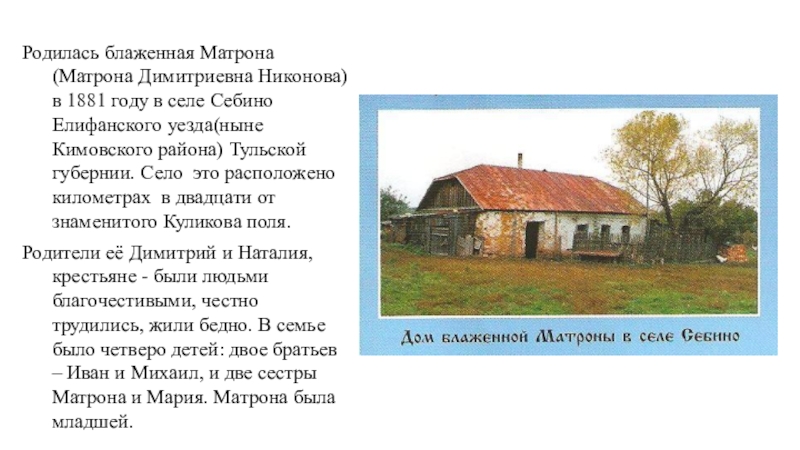 Слайд 2Родилась блаженная Матрона(Матрона Димитриевна Никонова) в 1881 году в селе Себино