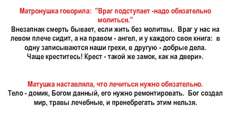 Слайд 12Матронушка говорила: ”Враг подступает -надо обязательно молиться.”