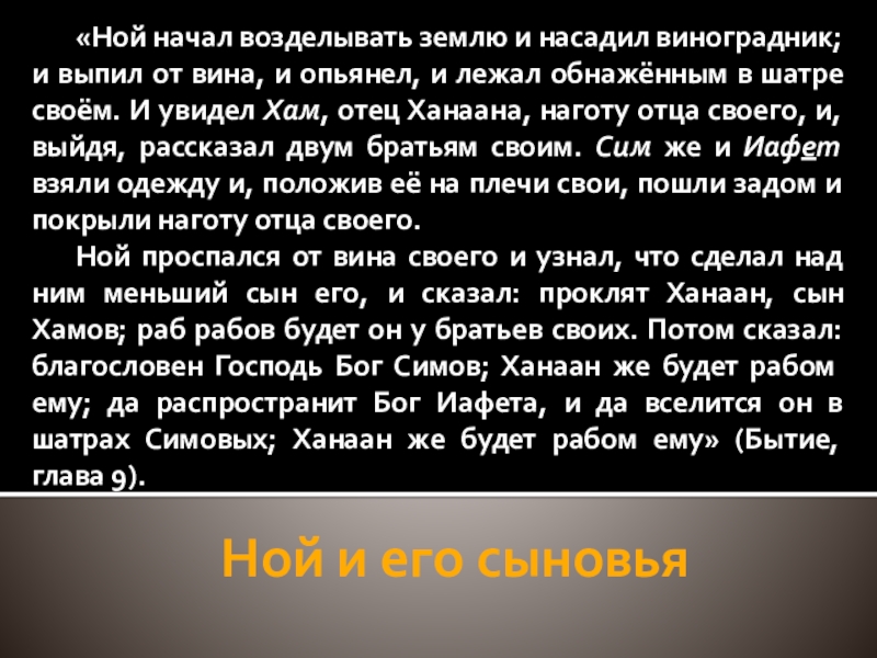 Ной проспался от вина своего и узнал, что сделал над ним меньший сын его, и сказал: проклят Ханаан, сын Хамов; раб рабов будет он у братьев своих. Потом сказал: благословен Господь Бог Симов; Ханаан же будет рабом ему; да распространит Бог Иафета, и да вселится он в шатрах Симовых; Ханаан же будет рабом ему» (Бытие, глава 9).