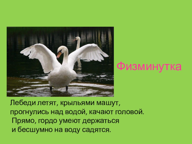 ФизминуткаЛебеди летят, крыльями машут, прогнулись над водой, качают головой. Прямо, гордо умеют держаться и бесшумно на воду