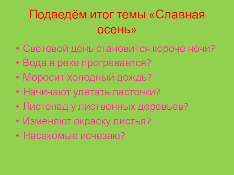 Подведём итог темы «Славная осень»Световой день становится короче ночи?Вода в реке прогревается?Моросит холодный дождь?Начинают улетать ласточки?Листопад у