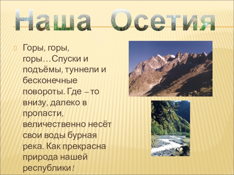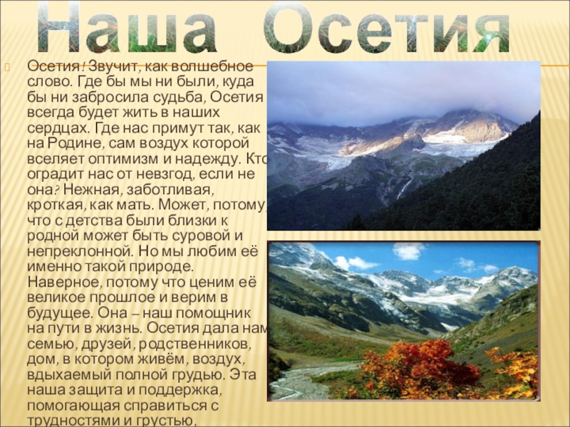 Слайд 6Осетия! Звучит, как волшебное слово. Где бы мы ни были, куда