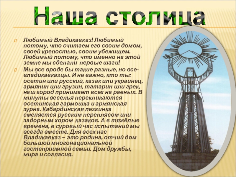 Слайд 5Любимый Владикавказ! Любимый потому, что считаем его своим домом, своей крепостью,