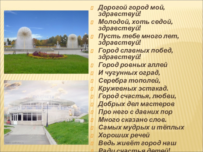 Дорогой город мой, здравствуй!Молодой, хоть седой, здравствуй!Пусть тебе много лет, здравствуй!Город славных побед, здравствуй!Город ровных аллейИ чугунных