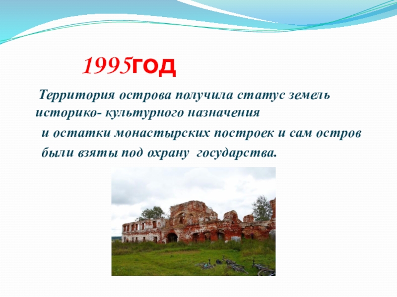 1995год  Территория острова получила статус земель историко- культурного назначения   и остатки монастырских построек и