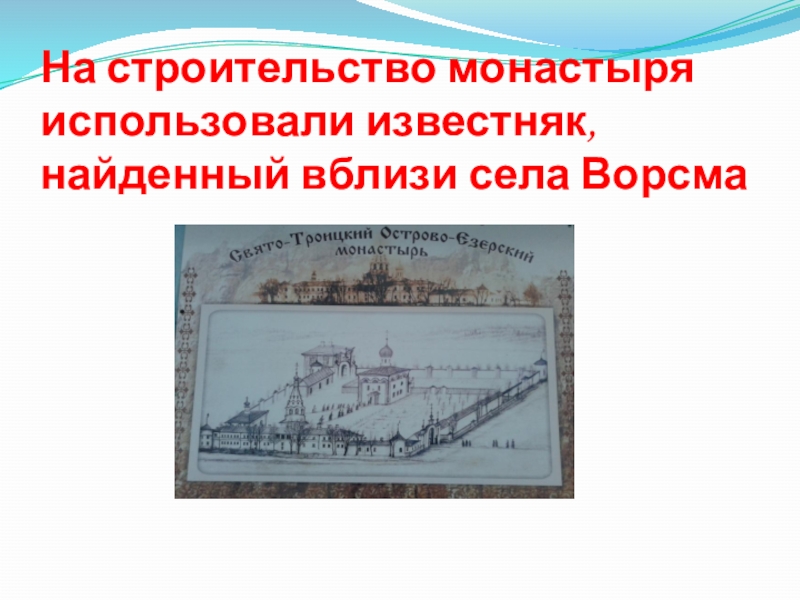 Слайд 4На строительство монастыря использовали известняк, найденный вблизи села Ворсма