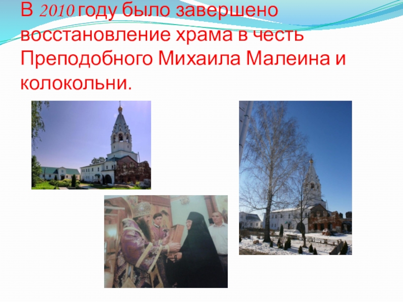 Слайд 10В 2010 году было завершено восстановление храма в честь Преподобного Михаила