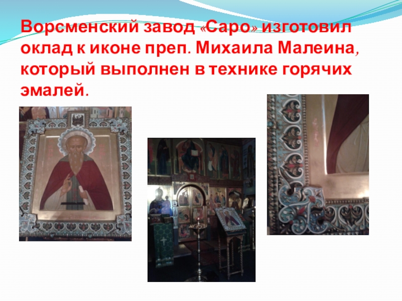 Слайд 19Ворсменский завод «Саро» изготовил оклад к иконе преп. Михаила Малеина, который
