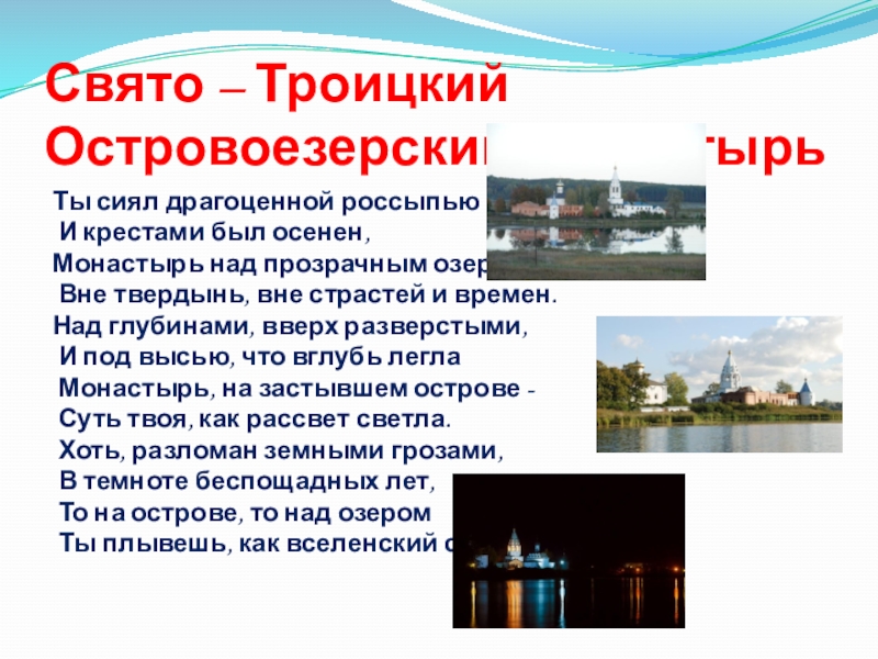 Свято – Троицкий Островоезерский монастырь Ты сиял драгоценной россыпью И крестами был осенен,Монастырь над прозрачным озером –