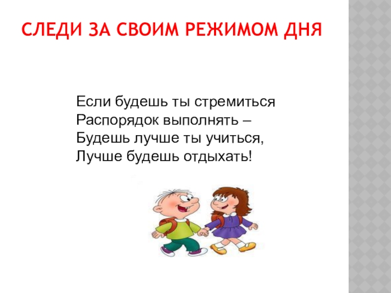 Следи за своим режимом дня Если будешь ты стремитьсяРаспорядок выполнять –Будешь лучше ты учиться,Лучше будешь отдыхать!