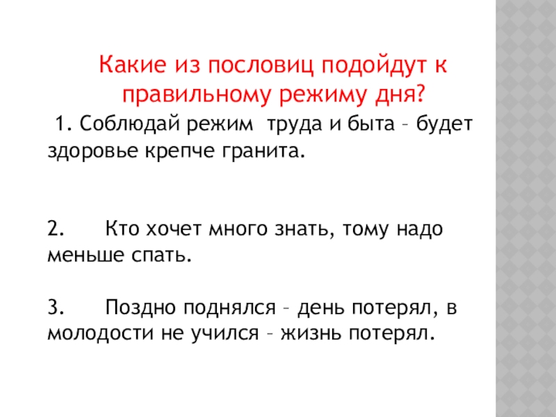 Какие из пословиц подойдут к правильному режиму дня? 1. Соблюдай режим труда и быта – будет здоровье крепче гранита.     2. Кто хочет много знать, тому надо меньше спать.   3.