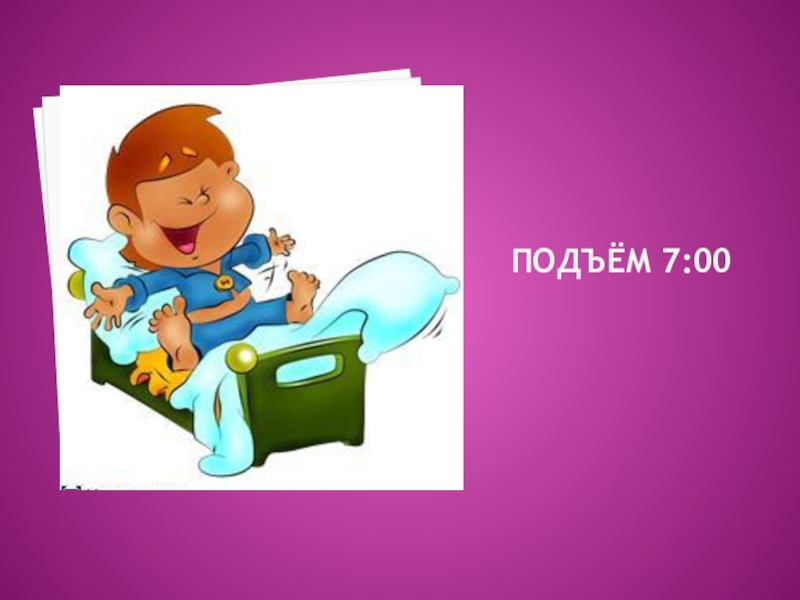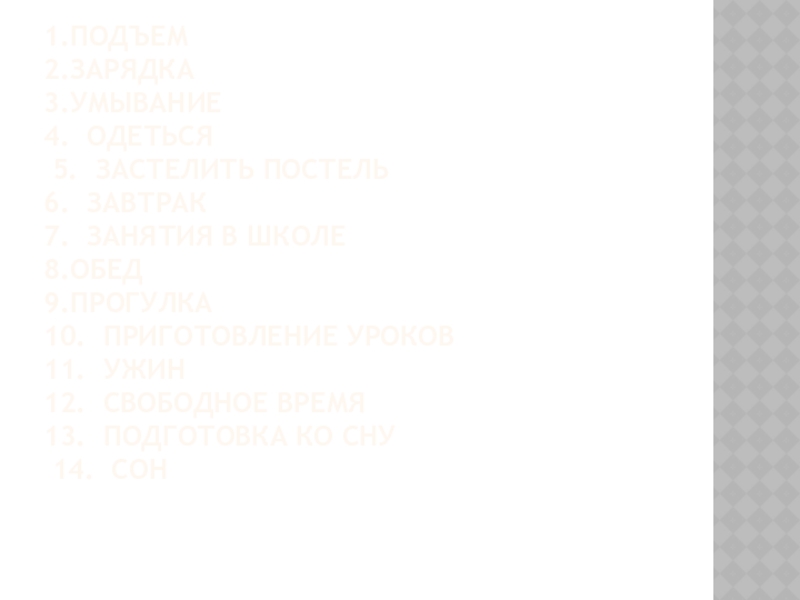 Слайд 181.Подъем 2.Зарядка 3.Умывание 4. Одеться 5. Застелить постель 6. Завтрак 7. Занятия в школе 8.Обед 9.Прогулка 10.