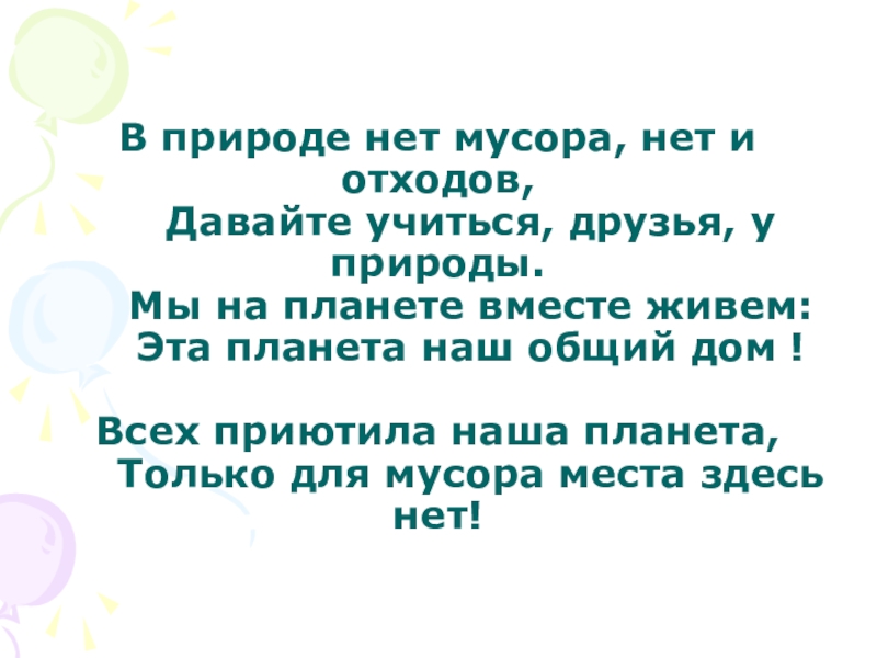 учиться, друзья, у природы. Мы на планете вместе живем: Эта планета наш общий дом ! Всех приютила наша планета, Только для мусора места здесь нет!