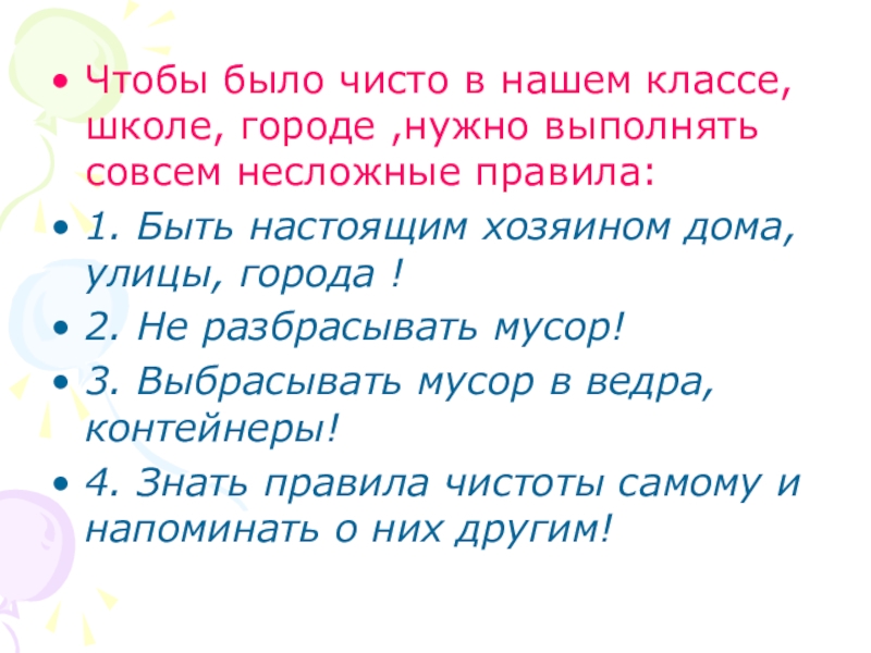 Чтобы было чисто в нашем классе, школе, городе ,нужно выполнять совсем несложные правила:1. Быть настоящим хозяином дома, улицы, города !2. Не разбрасывать мусор!3. Выбрасывать мусор в ведра, контейнеры!4. Знать правила чистоты самому и напоминать о них