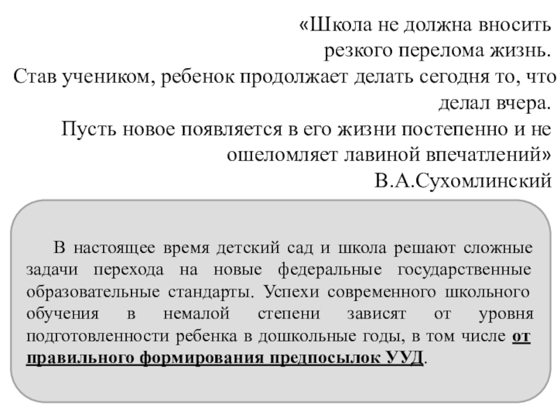 В настоящее время детский сад и школа решают сложные задачи перехода на новые федеральные государственные образовательные стандарты. Успехи современного школьного обучения в немалой степени зависят от уровня подготовленности ребенка в дошкольные годы, в том числе от правильного формирования предпосылок УУД.