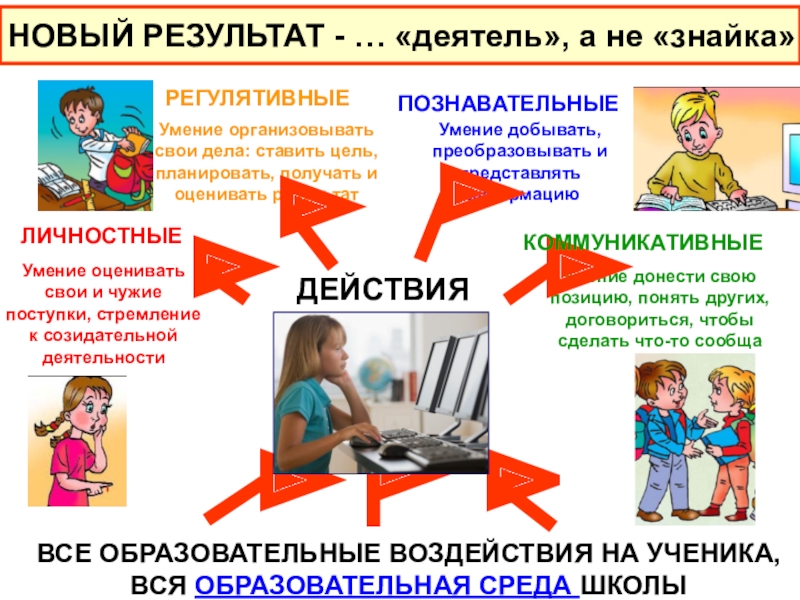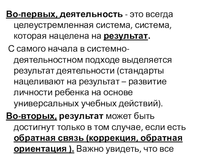 С самого начала в системно-деятельностном подходе выделяется результат деятельности (стандарты нацеливают на результат – развитие личности ребенка на основе универсальных учебных действий).
