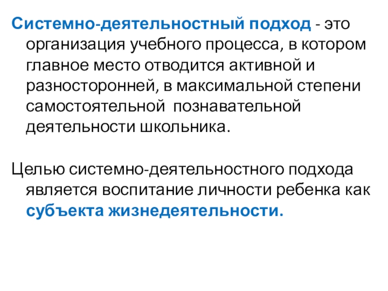 Целью системно-деятельностного подхода является воспитание личности ребенка как субъекта жизнедеятельности.
