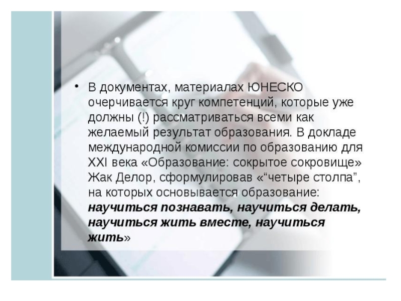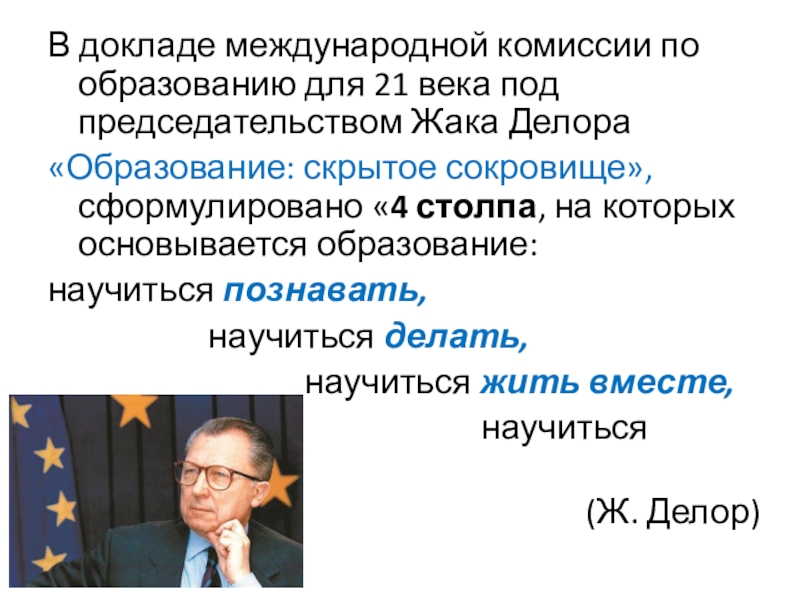 Слайд 7В докладе международной комиссии по образованию для 21 века под председательством