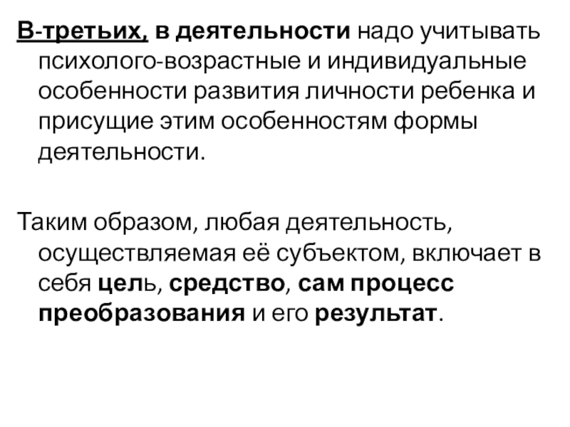 Слайд 34В-третьих, в деятельности надо учитывать психолого-возрастные и индивидуальные особенности развития личности