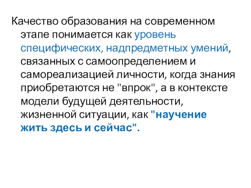 Слайд 12Качество образования на современном этапе понимается как уровень специфических, надпредметных умений,
