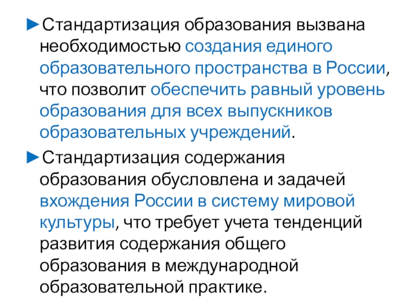 Слайд 4►Стандартизация образования вызвана необходимостью создания единого образовательного пространства в России, что