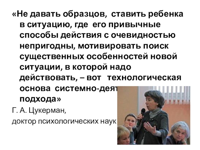 действия с очевидностью непригодны, мотивировать поиск существенных особенностей новой ситуации, в которой надо действовать, – вот технологическая основа системно-деятельностного подхода»