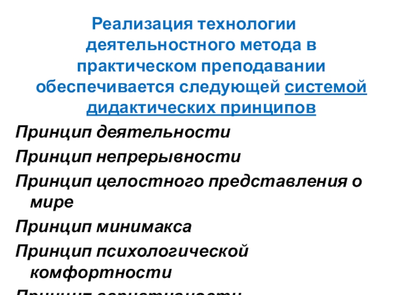 Слайд 38Реализация технологии деятельностного метода в практическом преподавании обеспечивается следующей системой дидактических