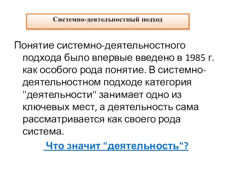 Слайд 32Понятие системно-деятельностного подхода было впервые введено в 1985 г. как особого
