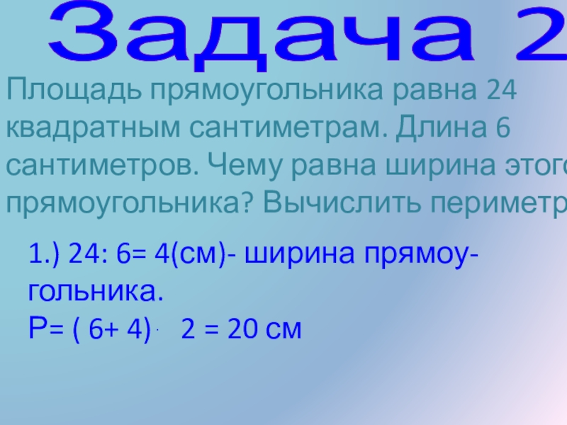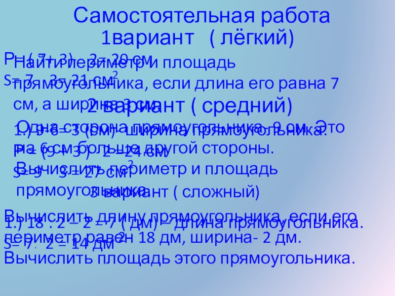 1.) 18 : 2 – 2 = 7 ( дм) – длина прямоугольника.