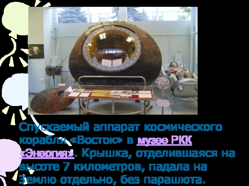 Слайд 9Спускаемый аппарат космического корабля «Восток» в музее РКК «Энергия». Крышка, отделившаяся на
