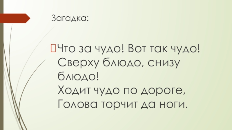 Загадка: Что за чудо! Вот так чудо! Сверху блюдо, снизу блюдо! Ходит чудо по дороге, Голова торчит