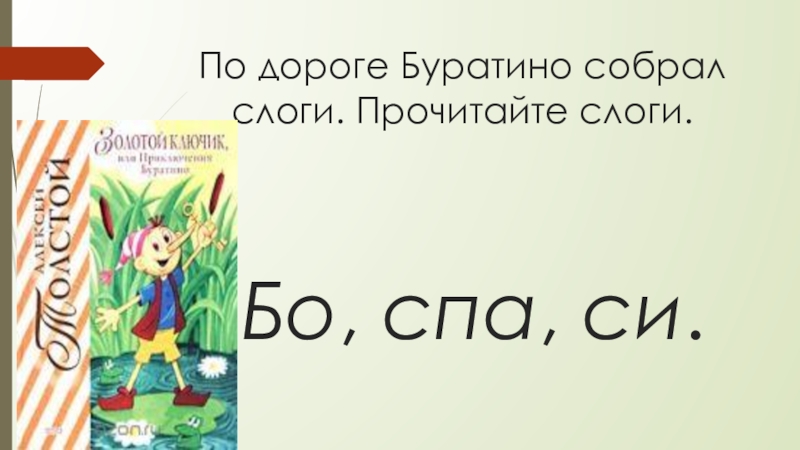 Слайд 17По дороге Буратино собрал слоги. Прочитайте слоги.  Бо, спа, си.