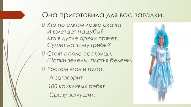 Она приготовила для вас загадки. Кто по елкам ловко скачет И взлетает на дубы? Кто в дупле