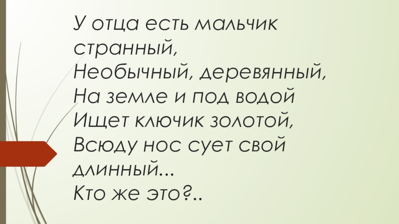 У отца есть мальчик странный, Необычный, деревянный, На земле и под водой Ищет ключик золотой, Всюду нос сует свой длинный... Кто же это?..