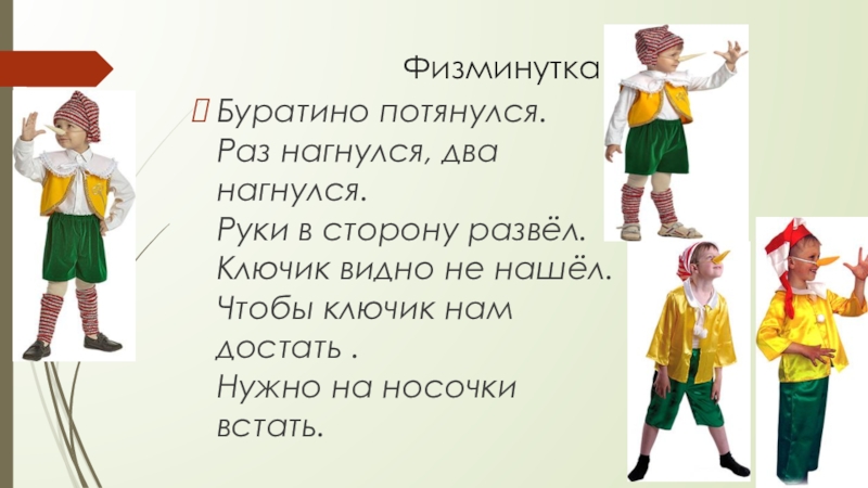 ФизминуткаБуратино потянулся. Раз нагнулся, два нагнулся. Руки в сторону развёл. Ключик видно не нашёл. Чтобы ключик нам