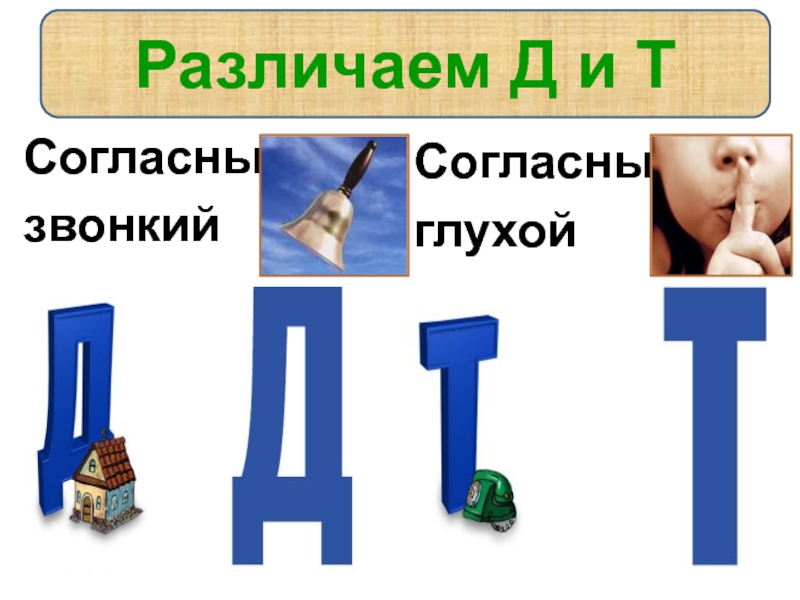 Согласный, звонкийСогласный,глухойПарные звонкие и глухие согласныеРазличаем Д и Т