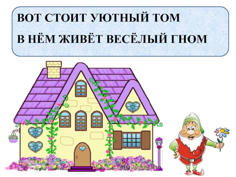 ВОТ СТОИТ УЮТНЫЙ ДОМВ НЁМ ЖИВЁТ ВЕСЁЛЫЙ ГНОМ