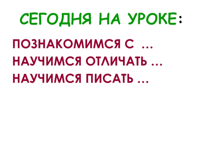 СЕГОДНЯ НА УРОКЕ:ПОЗНАКОМИМСЯ С …НАУЧИМСЯ ОТЛИЧАТЬ …НАУЧИМСЯ ПИСАТЬ …