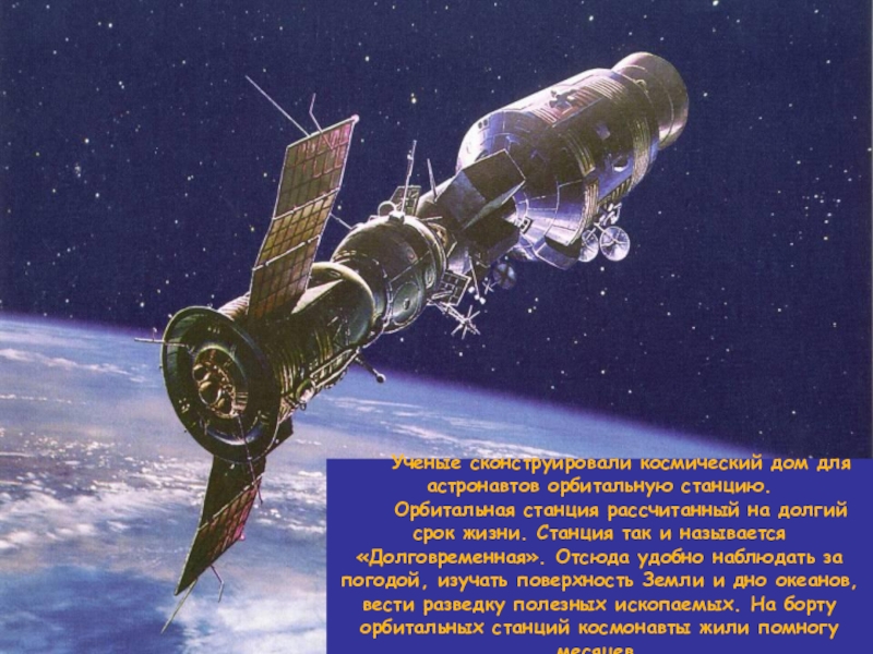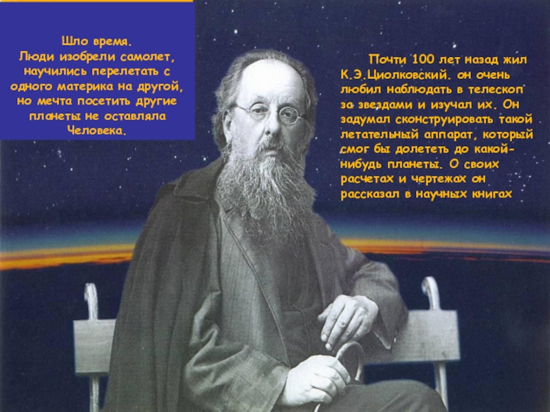 Почти 100 лет назад жил К.Э.Циолковский. он очень любил наблюдать в телескоп за звездами и изучал их. Он задумал сконструировать такой летательный аппарат, который смог бы долететь до какой-нибудь планеты. О своих расчетах и чертежах он рассказал в научных книгах