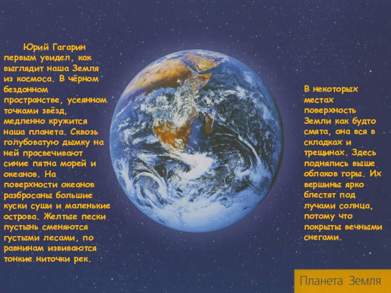В некоторых местах поверхность Земли как будто смята, она вся в складках и трещинах. Здесь поднялись выше облаков горы. Их вершины ярко блестят под лучами солнца, потому что покрыты вечными снегами.