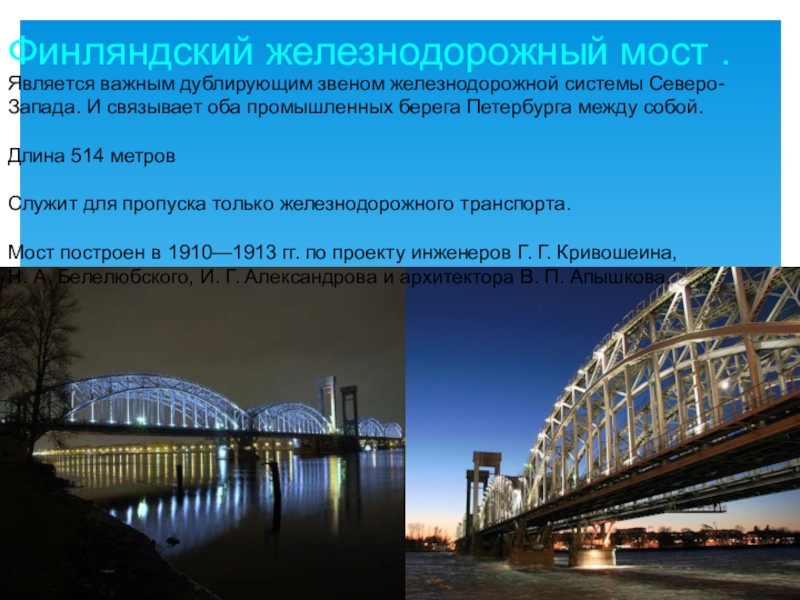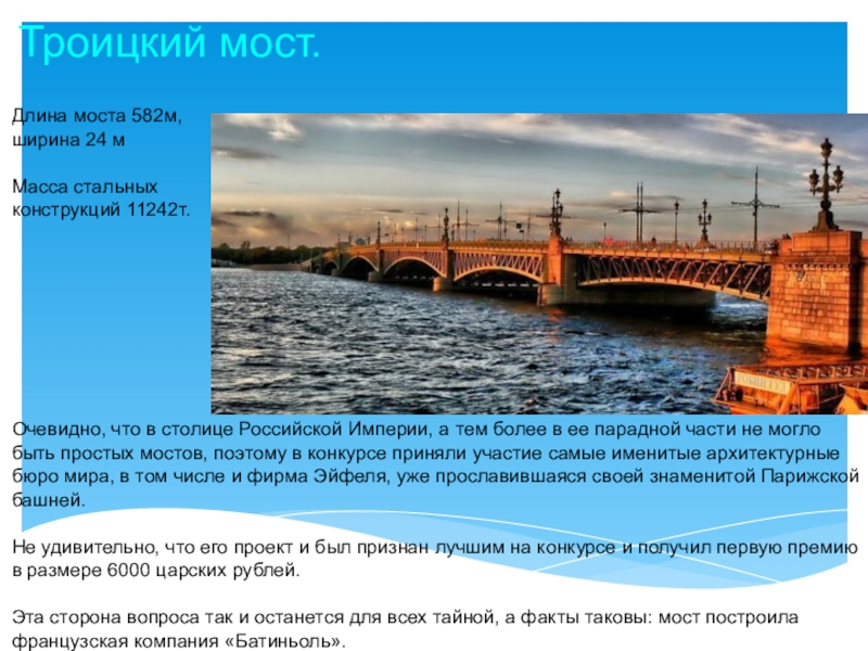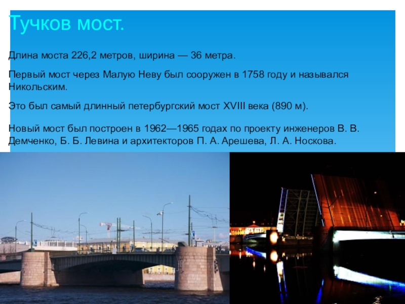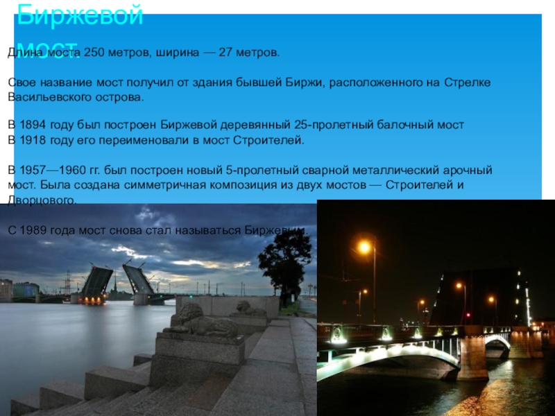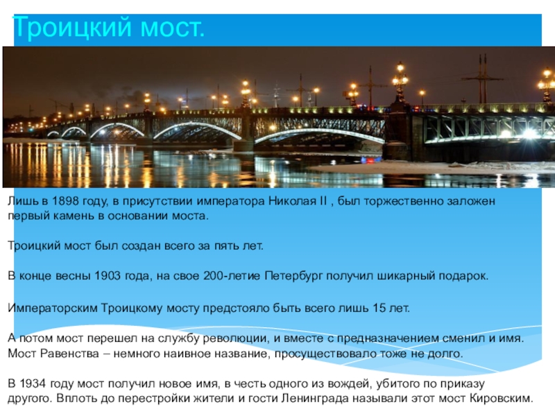 Был первым постоянным мостом через Неву.