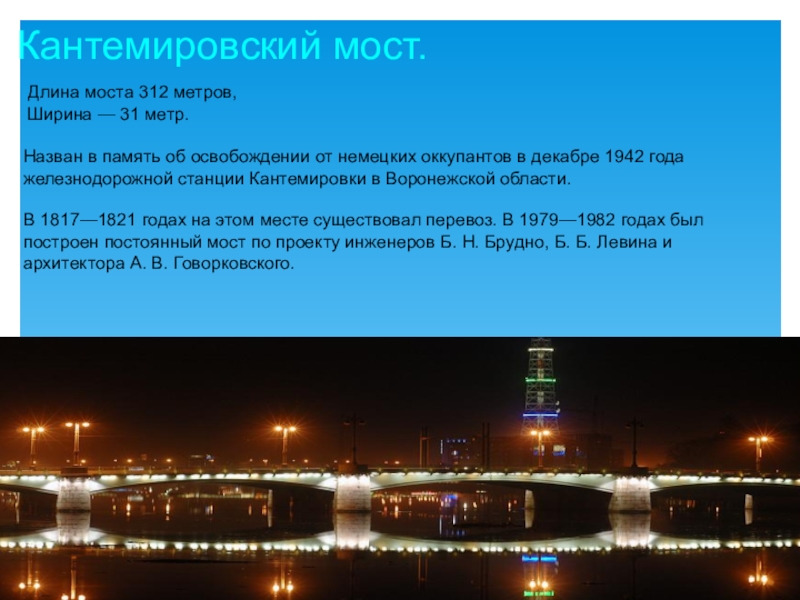Новый мост был построен в 1962—1965 годах по проекту инженеров В. В. Демченко, Б. Б. Левина и архитекторов П. А. Арешева, Л. А. Носкова.