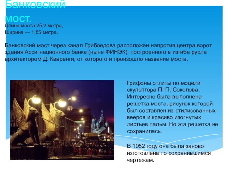 Грифоны отлиты по модели скульптора П. П. Соколова. Интересно была выполнена решетка моста, рисунок которой был составлен из стилизованных вееров и красиво изогнутых листьев пальм. Но эта решетка не сохранилась.