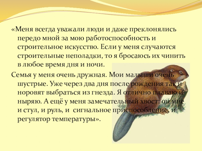 Семья у меня очень дружная. Мои малыши очень шустрые. Уже через два дня после рождения так и норовят выбраться из гнезда. Я отлично плаваю и ныряю. А ещё у меня замечательный хвост: он мне и стул, и руль, и сигнальное приспособление, и регулятор температуры».